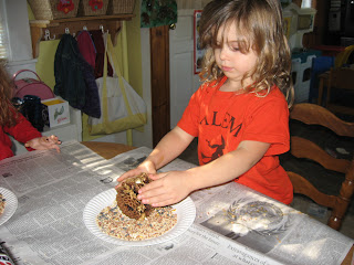 Making pine cone bird feeders, was great fun for Willow and Catriona today!!! I got this idea from the Little Acorn Learning curriculum by Eileen Straiton...